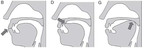 Рис. 23. Звуки «BA», «DA», «GA» соответственно произносятся в передней, средней и задней частях рта. Если вы слышите «ВА», а перед вашими глазами возникает «GA», вы воспринимаете промежуточный слог, то есть «DA»