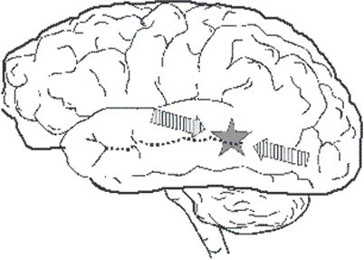 Рис. 24. Верхняя височная борозда (указана пунктиром), расположенная на границах слуховой коры (состоящей из множества так называемых карт, каждая из которых анализирует отдельные свойства звука) и зрительной (или полосатой) коры головного мозга, является главным звеном в формировании эффекта Макгарка, на который можно влиять, используя метод внечерепной магнитной стимуляции в стратегическом для этого месте (звездочка)