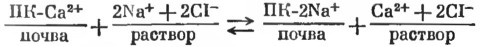 Как видим, в твердой части почвы в обменном состоянии находится двухвалентный катион (Са2+), а в растворе — хлорид одновалентного металла натрия, диссоциировавший на катион (Na+) и анион (Cl-). Катион натрия из раствора (Na+) поглощается ПК, а взамен из ПК в раствор переходит обменный катион Са2+. Вскоре между ПК и раствором наступит равновесие — в ПК и в растворе будут Са2+ и Na+. Но если процесс протекает в динамическом режиме, т. е. в почву поступают все новые и новые порции раствора (например, при засолении грунтовыми водами), то постепенно состав ПК может измениться и в нем вместо Са2+ начнет преобладать Na+ (рис. 1).