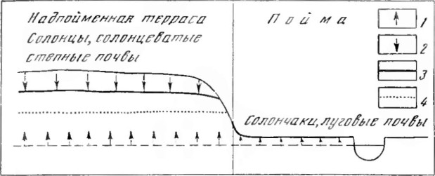 1 — засоление почв — образование солончаков, вхождение натрия в поглощающий комплекс; 2 — рассоление почв — образование солонцов, вымывание солей из верхних горизонтов почв, формирование рассоленного солонцового горизонта В, поглощающий комплекс которого содержит много обменного натрия; 3 — верхняя граница засоленного горизонта; 4 — былой уровень залегания грунтовых вод (в пойменную стадию)