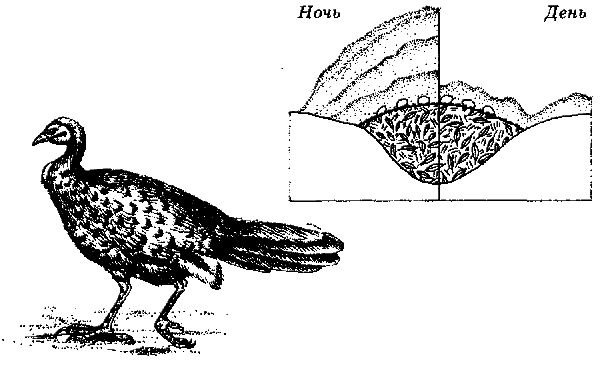 Чтобы поддерживать процессы гниения на необходимом уровне, самцу весь растянутый период размножения, 11 месяцев в году, приходится трудиться не покладая рук. Он постоянно ворошит мусор, позволяя кислороду проникать внутрь кучи, постоянно подбрасывает в нее «дровишки» — новые порции мусора — или разгребает кучу, чтобы предохранить яйца от перегревания. Для точного определения температуры у самцов есть градусник: измеряя температуру, он засовывает в мусор клюв.