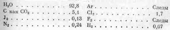 Избыток летучих — довольно внушительная величина и по отдельным компонентам превышает в десятки и даже сотни раз летучий материал от выветривания коренных изверженных пород литосферы. В избытке летучих паров Н2О в 128 раз, СО2 в 83, a Cl в 60 раз больше, чем это могла бы продуцировать первичная земная кора при ее полном интенсивном разрушении. Состав избытка летучих следующий (в вес. %):