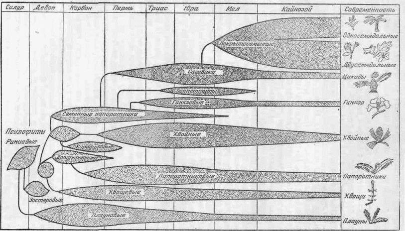 После завоевания суши развитие растительности привело к образованию многочисленных и разнообразных форм. Интенсивное разделение растительных групп началось в девоне и продолжалось в последующее геологическое время. Общая родословная важнейших групп растений дана на рис. 14.