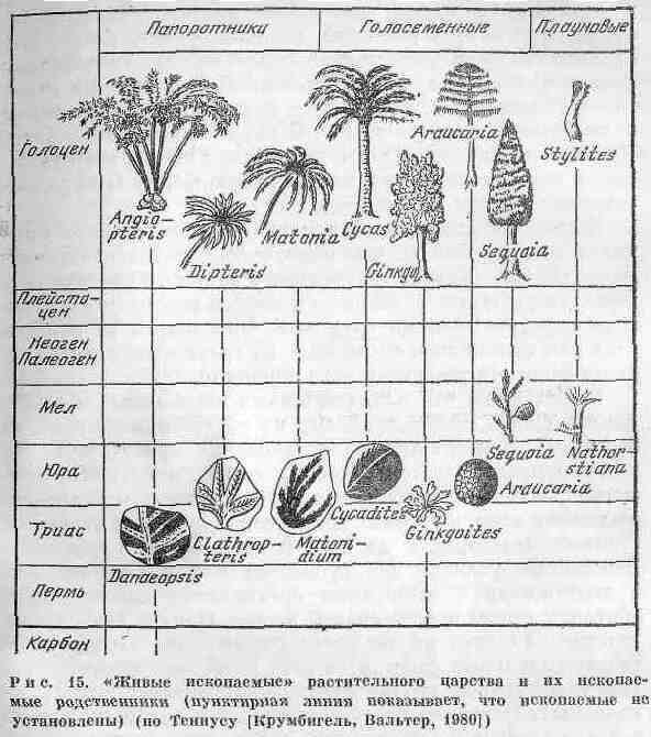 Как отмечал знаток ископаемой флоры А. Н. Кршптофович, многие роды растений, владыки древних лесов, также существовали чрезвычайно долго, особенно в палеозое; например, Sigillaria, Lepidodendron, Calamites — не менее 100-130 млн лет. Столько же — мезозойские папоротники 11 хвойные Metasequoia. Род Ginkgo насчитывает более 150 млн лет, а современный вид Ginkgo biloba, если включать в него, по существу, неотличимую форму Ginkgo adiantoides, — около 100 млн лет.