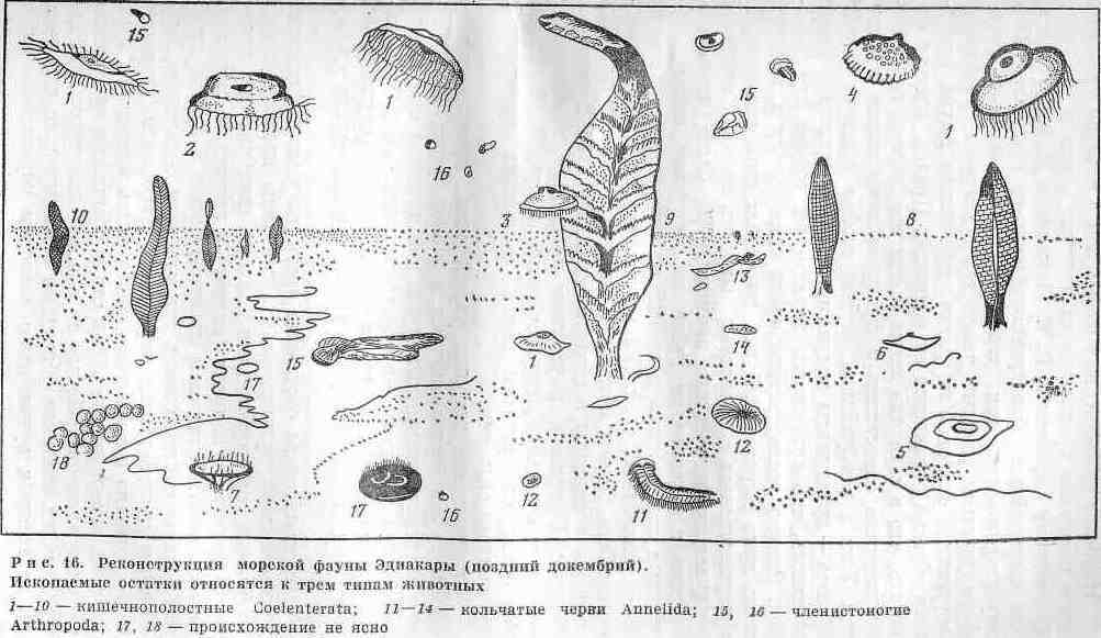Все главные типы беспозвоночных животных возникли в докембрии и дали начало в высшей степени разнообразному миру водных и наземных форм в течение всего фанерозоя. Возникновение животных от их растительных предков, естественно, было связано с переходом от автотрофного способа питания к гетеротрофному. Этот переход, по-видимому, был постепенным, в течение длительного геологического времени. В докембрии происходило развитие различных водорослей, которые послужили основной питательной базой для морских животных.