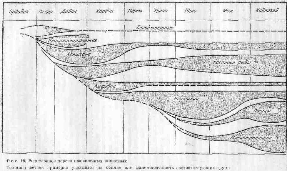 Происхождение позвоночных изучено лучше, чем других животных. По данным палеонтологии, сравнительной анатомии и эмбриологии, эволюция низших позвоночных первоначально совершалась в воде и привела к возникновению самых разнообразных круглоротых и рыб, которые приспособились к условиям обитания. Вероятнее всего, первые рыбы произошли от маленьких мягкотелых хордовых организмов, имевших хорду и жабры и живших за счет фильтрации частиц из морской воды. Переломным этапом в эволюции позвоночных был выход их на сушу. Предками наземных позвоночных были кистеперые рыбы, а древнейшими представителями сухопутных животных — земноводные (рис. 19).