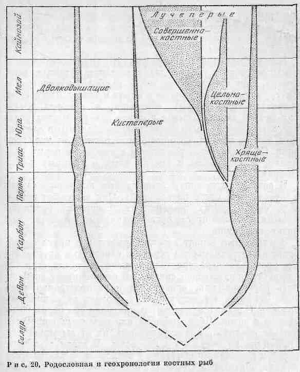 Костные рыбы зародились в раннем девоне и первоначально обитали в пресноводных водоемах. В конце палеозоя они стали господствующей группой пресноводных позвоночных и заселили моря. Родословная и геохронология костных рыб представлены на рис. 20. В фауне современных водоемов большинство рыб относятся к классу костных. Они подразделяются на три подкласса: лучеперые с лучеобразными плавниками, двоякодышащие, кистеперые. Все они обнаружены в ископаемом состоянии в нижнем девоне и, возможно, происходят от акантодиев. У большинства современных костистых рыб имеется плавательный пузырь, регулирующий глубину плавания. Двоякодышащие рыбы обитали в пресных водах и, судя по строению тела, плавали всегда медленно. Они приспособились к жизни в периодически высыхающих реках и мелководных озерах. Легкие помогали им выжить в сухой сезон и в дальнейшем набраться сил в период дождей, когда в воде можно было дышать жабрами. В связи с этим двоякодышащие выжили в условиях, не переносимых другими рыбами. В настоящую эпоху существует лишь три вида двоякодышащих рыб, обитающих в реках Южной Африки, Австралии и Южной Америки, — своеобразные живые ископаемые.