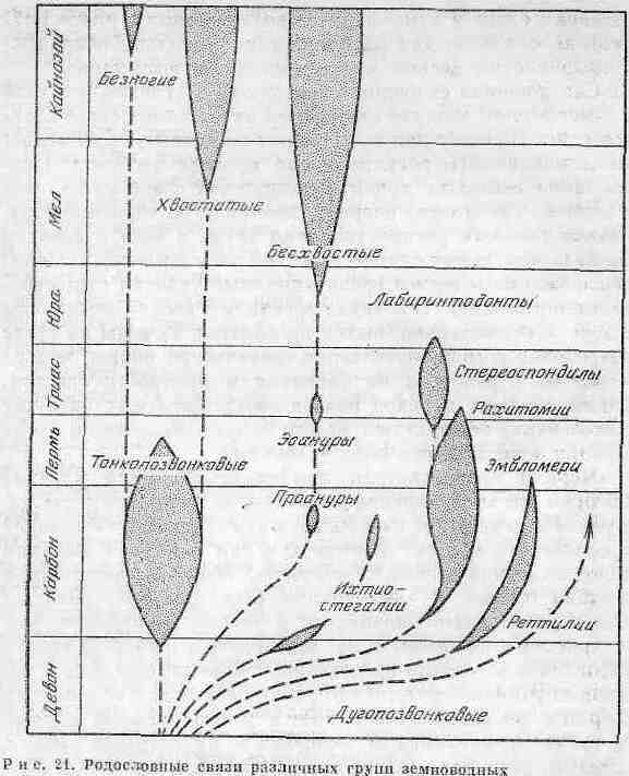 По палеонтологическим данным, земноводные появились в раннем девоне. Родословная земноводных в масштабах геологического времени представлена на рис. 21. Предками земноводных были кистеперые рыбы, обладавшие легкими и парными плавниками, из которых могли возникнуть пятипалые конечности. Такое заключение подтверждается поразительным сходством покровных костей черепа кистеперых с костями черепа палеозойских земноводных. У земноводных животных и кистеперых рыб были как верхние, так и нижние ребра, которые отсутствовали у двоякодышащих рыб, ведущих в общем земноводный образ жизни. Двоякодышащие рыбы, обладавшие легкими, по целому ряду признаков отличались от земноводных, а значит, не могли быть их непосредственными предками.