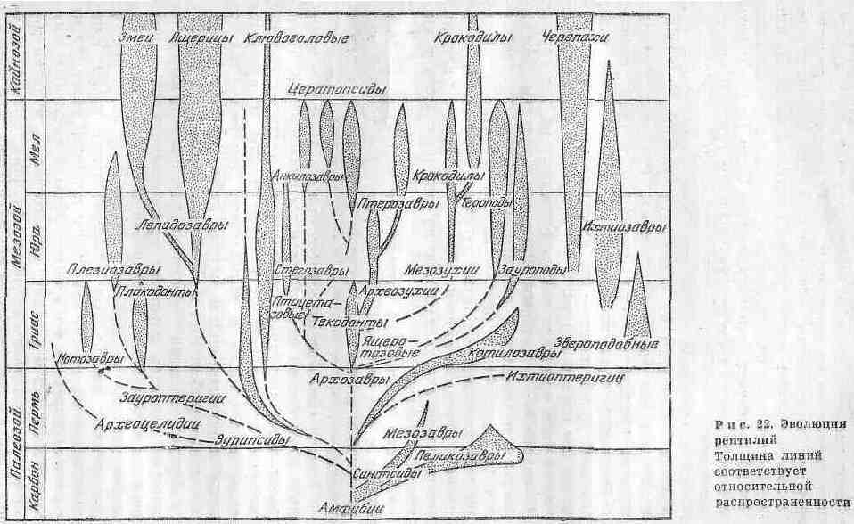 Родословные связи различных групп рептилий представлены на рис. 22. Наиболее примитивной формой из всех ископаемых рептилий была сеймурия (Seymouria) — небольшое животное (от 0,5 м длиной), сохранившее ряд признаков земноводных. Практически у него отсутствовала шея, зубы имели примитивное строение, а кости черепа в деталях были сходны с черепной крышкой стегоцефалов. Детальное изучение сеймуроподобных рептилий и их остатков, найденных на территория СССР, позволило выделить группу батрехозавров, которые занимали промежуточное положение между земноводными и котилозаврами. По имеющимся данным палеонтологии и сравнительной анатомии можно заключить, что котилозавры были группой, которая дала начало всем другим основным группам пресмыкающихся.