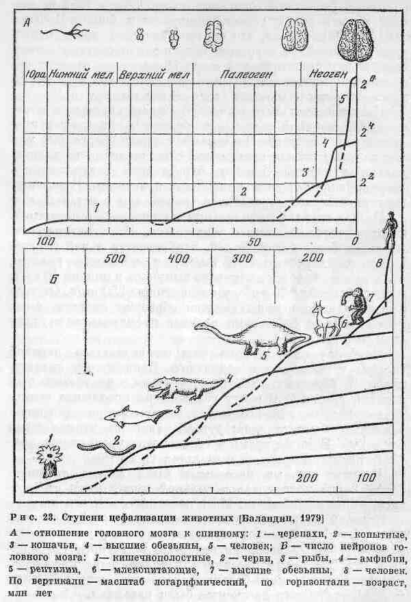 Таким образом, рост цефализапии в ходе геологической истории животных является несомненным фактом и может быть принят в качестве правила, которое В. И. Вернадский назвал принципом Дана. «В хронологическом выражении геологических периодов, — писал В. И. Вернадский еще в 1902 г., — мы непрерывно можем проследить это явление от мозга моллюсков, ракообразных и рыб до мозга человека. Нет ни одного случая, чтобы появлялся перерыв и существовало время, когда добытые этим процессом сложность и сила центральной нервной системы были потеряны и появлялся геологический период, геологическая система с меньшим, чем в предыдущем периоде, совершенством центральной нервной системы».