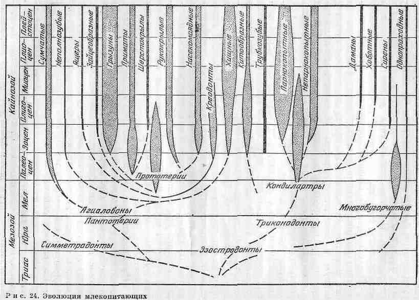 Ближайшими предками млекопитающих были древние палеозойские рептилии, сохранившие некоторые черты строения амфибий: кожные железы, расположение сочленений в конечностях. Палеонтологи допускают, что подобной предковой группой был подкласс звероподобных (Theroinorpha). Наиболее близок к млекопитающим один из его отрядов — зверозубых (Theriodontia). У ископаемых остатков этих животных зубы были дифференцированы на те же группы, что и у млекопитающих, т.е. на резцы, клыки и коренные, и находились они в альвеолах. Имелось вторичное костное нёбо — весьма характерный признак млекопитающих. Родословные связи отдельных групп млекопитающих животных представлены на рис. 24.