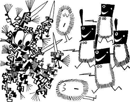 Безусловно, одним лейкоцитам не удалось бы отстоять организм от проникающих в него микробов. В крови любого животного много различных веществ, которые способны склеивать, убивать и растворять попавших в кровеносную систему микробов, превращать в нерастворимые вещества и обезвреживать выделяемый ими токсин. Некоторые из этих защитных веществ мы получаем по наследству от родителей, другие учимся вырабатывать сами в борьбе с окружающими нас бесчисленными врагами.