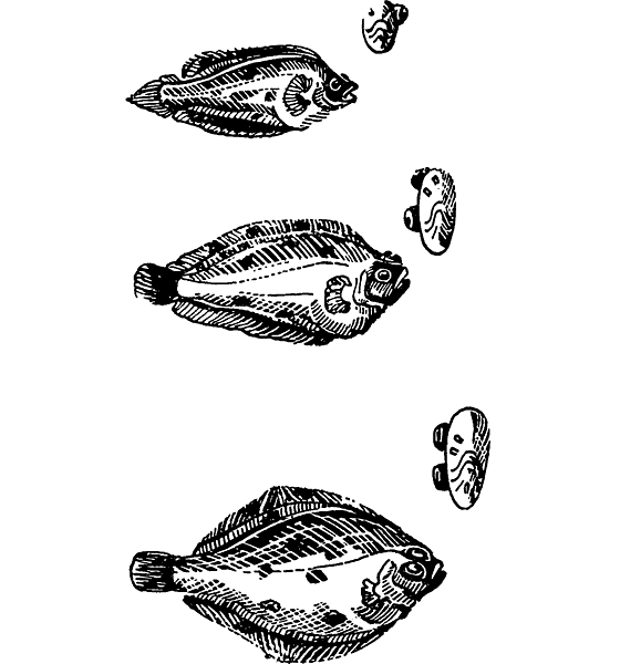 Интересно, что у камбал в младенческом возрасте глаза расположены так же, как у большинства рыб, — по обеим сторонам головы. В это время камбалы имеют цилиндрическую форму тела, живут в толще воды и кормятся зоопланктоном. Позднее они переходят на питание червями, моллюсками, а иногда и рыбками. И тут с камбалами происходят замечательные превращения: левая сторона начинает у них расти быстрее, чем правая, левый глаз переходит на правую сторону, тело становится плоским, и в конце концов оба глаза оказываются на правой стороне. Закончив превращение, камбалы опускаются на дно и ложатся на левый бок — не зря их метко прозвали лежебоками.