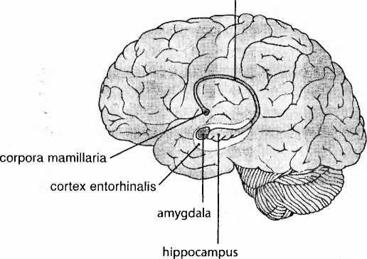 Рис. 25. Путь, который информация проходит в нашем мозге к долговременной памяти, начинается в энторинальной области коры (cortex entorhinalis), расположенной с внутренней стороны в парагиппокампальной извилине (gyrus parahippocampalis). Затем информация, направляемая префронтальной корой, на короткое время запоминается в гиппокампе. Потом из гиппокампа информация частично направляется обратно в височную кору для долговременного запоминания, частично — длинным путем по большой дуге через свод (fornix), расположенный в перегородке (septum), в направлении гипоталамуса, откуда нервные волокна ведут к сосцевидным телам (corpora mamillaria). Отсюда информация через таламус идет к различным отделам коры больших полушарий. Миндалевидное тело, или амигдалоидное ядро (amygdala), лежащее непосредственно перед гиппокампом (hippocampus) и височной долей, накладывает на воспоминание отпечаток эмоциональной окрашенности.