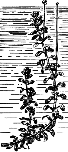 Рис. 97. Элодея (Elodea canadensis). Женский экземпляр, цветы с длинными трубочками венчиков, похожими на цветоножки.