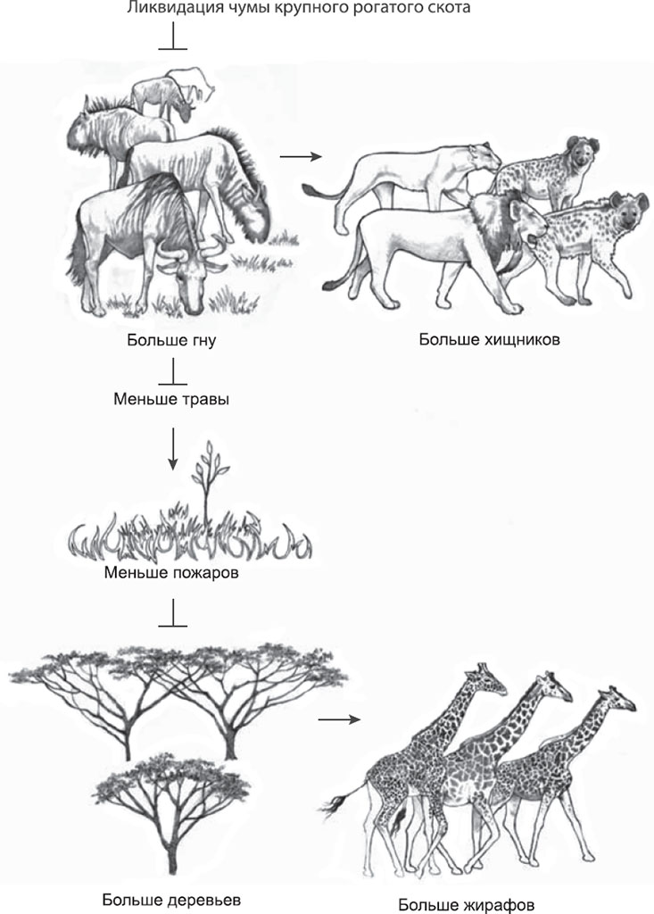 Спустя несколько недель Синклер и Нортон-Гриффитс вновь поразились, когда проявили пленку с «переписью гну» и подсчитали, что популяция этих животных составляет уже 1,4 млн особей, то есть практически удвоилась за последние четыре года и выросла более чем впятеро по сравнению с 1961 г. Теперь это было крупнейшее стадо диких копытных в мире. Другие ученые заметили, что в Серенгети в этот период произошли и всевозможные иные изменения. Например, увеличилась численность львов и гиен. Разумеется, это было логично, ведь доступной дичи стало больше. Лишний миллион гну или около того – это около 130 000 тонн лишней биомассы, которой может прокормиться множество хищников. Но были и другие, менее понятные изменения, причины которых по отдельности казались не столь очевидными. Например, также увеличилась численность жирафов. Была ли какая-нибудь связь между количеством жирафов и другими изменениями, происходившими в Серенгети?