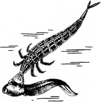 Вонзив в него челюсти, отрыгивает из пищевода особую жидкость. Через отверстие у основания челюсти она попадает в канал, по нему — к концу челюсти, а оттуда — в тело головастика.