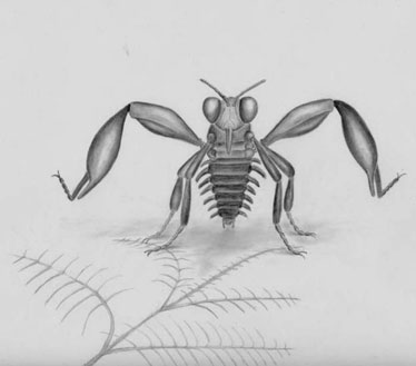 Рисунок 21. Странный Strashila incredibilis оправдывает свой видовой эпитет, будучи одним из самых загадочных насекомых мезозойской эры104. Его большие задние ноги приспособлены для прыжков и могли хвататься за стержни перьев пернатых динозавров. Его хоботок мог использоваться для добывания крови.
