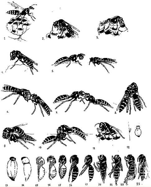 В гнезде полистов… 1 — угрожающая поза, оса готова к защите дома; 2 — строительство ячеи; 3 — кормление личинки; 4 — полиста придерживает передними ножками комок пищи, который проминает жвалами; 5 — полисту встречает голодная сестра по гнезду; 6–9 — разные позы во время кормового контакта отражают разное положение полистов в семье; 10 — то же означает и покусывание жвалами спинки другой полисты; 11 — матка-полиста откладывает яйцо в ячею; 12 — яйцо и рядом личинка младшего возраста; 13 — личинка старшего возраста; 14 — предкуколка; 15 — куколка на 4-й день; 16–18 — превращение куколки во взрослую полисту; 19–23 — полиста сбросила остатки кокона и полностью расправила крылья.