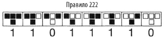 Интересно, что все эти 256 теоретических машин сильно различаются своими свойствами. Автоматы, которые Вольфрам отнес к классу I, такие как номер 222, создают предсказуемые рисунки. Если бы вас спросили, какой будет центральная ячейка после триллиона триллионов итераций правила 222, вы, не задумываясь, ответили бы: черной.