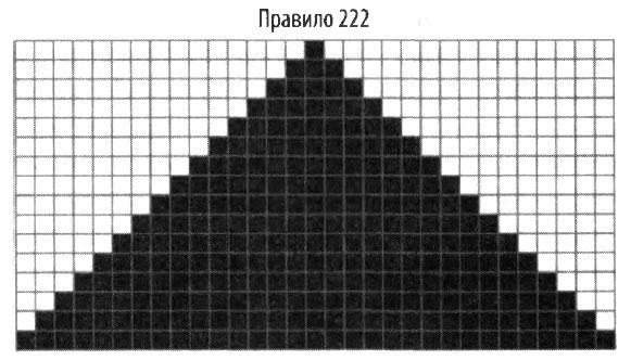Вселенная для такого простого клеточного автомата — лишь один ряд ячеек. Если мы начнем с ряда ячеек с единственной черной ячейкой в середине и проследим за эволюцией этой «вселенной» на протяжении множества поколений (каждый ряд, расположенный ниже предыдущего, соответствует следующему поколению), результат изменений в соответствии с правилом 222 будет выглядеть следующим образом.