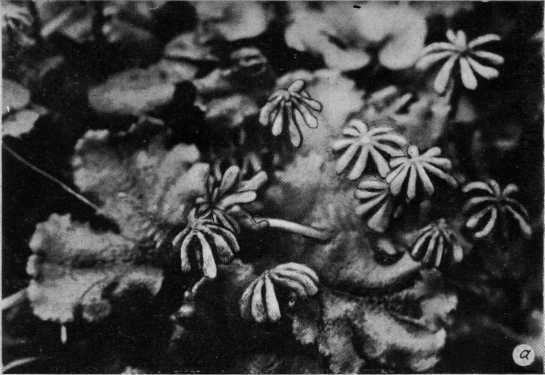 Таблица I. а — широко распространенный слоевищный печеночник Marchantia polymorpha. Видны многолучевые архегониальные (женские) подставки; б — свисающий эпифитный (бокоплодный) мох Leucodon pendulus — характерный представитель дальневосточной бриофлоры; в — листостебельный бокоплодный мох Pleuroziopsis ruthenica. Он широко распространен в хвойных лесах Дальнего Востока; г — коробочка верхнеплодного листостебельного мха Physcomitrium pyriforme — обитателя сырых глинистых субстратов.