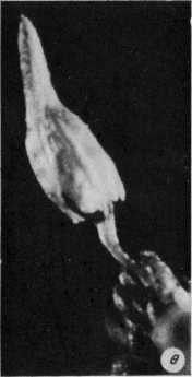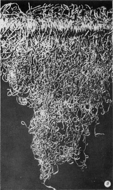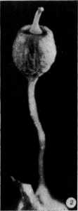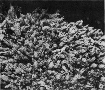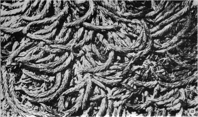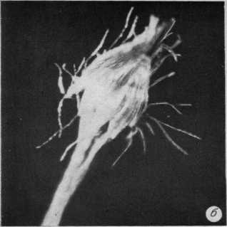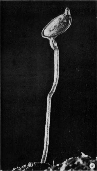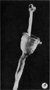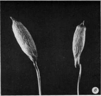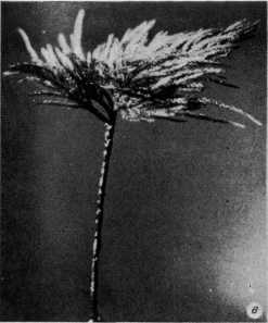 Таблица IV. а — бокоплодный листостебельный мох Leucodon sciuroides. обычный эпифит в широколиственных лесах европейской части СССР и юга советского Дальнего Востока; б — коробочка листостебельного мха из рода Ulota. Хорошо видны волоски на колпачке; в — густоволосистые колпачки представителя семейства политриховых (Polytrichaceae) — Pogonatum inflexum.