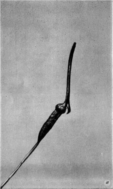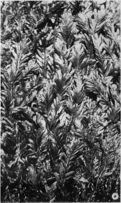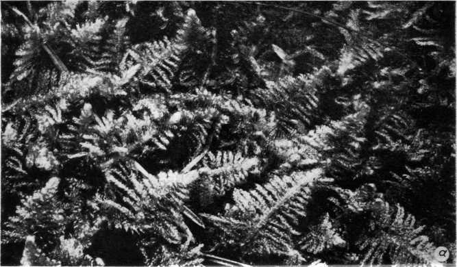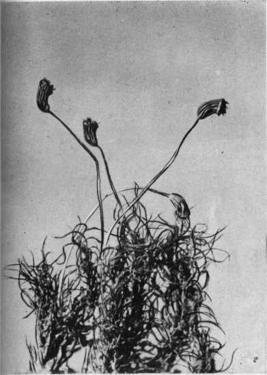 Таблица II. а — бокоплодный листостебельный мох Ptilium crista-castrensis («петушиный гребешок»), характерный обитатель густых и тенистых хвойных лесов; б — коробочка листостебельного верхоплодного мха тайлории. Торчащий из коробочки стерженек — колонка (после вскрытия коробочка тайлории сильно укоротилась, колонка же осталась прежней длины и стала сильно выступать из коробочки; в — верхнеплодный листостебельный мох Ptychomitrium sinense. Хорошо виден имеющий колокольчатую форму колпачок.