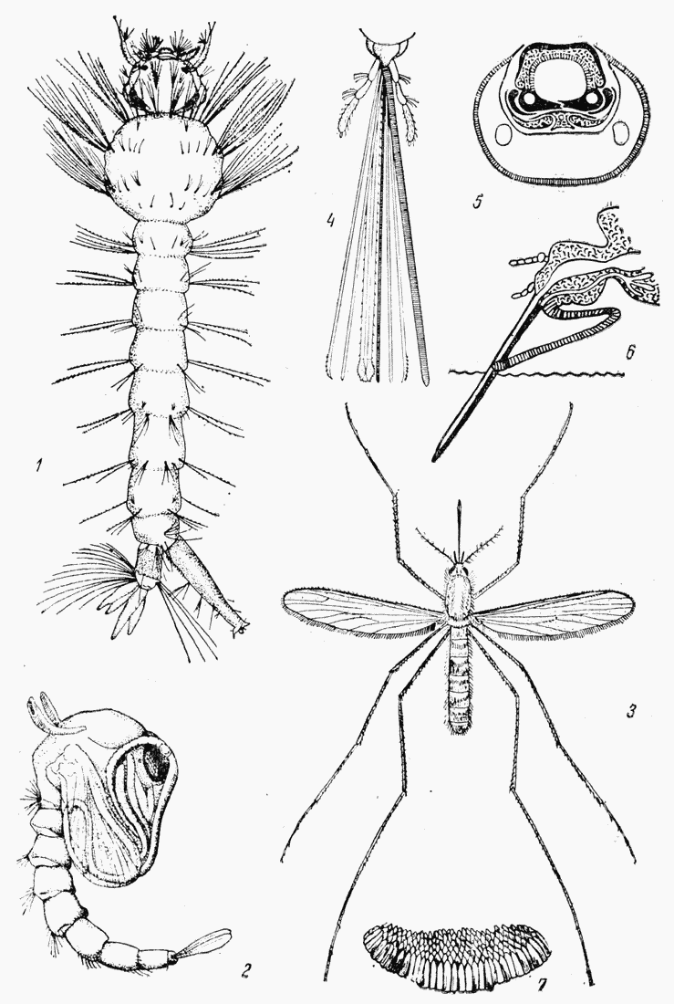 Крупные личинки 4-го возраста наиболее подходят для ознакомления с устройством их тела (LII, 2). Голова у личинки малярийного комара (Anopheles) относительно меньше, чем у С. pipiens и значительно уже сегментов груди. Усики несколько короче и толще. Глаза почковидные. Голова личинки анофелес еще более подвижна, чем у кулекс; будучи укреплена на тоненькой шее, она может поворачиваться на 180°. Пучки волосков на боковых лопастях (опахалах) верхней губы густые, слабо изогнутые. Верхняя челюсть личинки (LII, 3) представляет пластинку, на дистальном и внутреннем краях которой расположены ряды зубцов, зубчиков, волосков и длинных пильчато-зазубренных шипов. Нижние челюсти четырехугольной формы, с одночлениковым коротким и толстым щупиком, на конце которого находятся чувствительные сосочки (LII, 4). Нижняя губа - небольшая пластинка с зубчиками. Когда личинка, повернув на 180° свою голову, лежит у поверхности воды, она упирается в плёнку поверхностного натяжения дистальными концами нижнечелюстных щупиков, сохраняя таким образом горизонтальное положение головы, необходимое для работы губных опахал и мандибул. С помощью энергичных ритмических движений щеток верхней губы, достигающих 200 взмахов в минуту, личинка и создаёт фильтрационные токи воды, приносящие ей пищу. Действие токов у личинки 4-й стадии заметно на расстоянии 20 мм; облавливаемая ею при неподвижном положении тела площадь воды равняется 8 см2; личинка 1-й стадии облавливает только 20 мм2. Фильтрует личинка почти непрерывно, уделяя этой деятельности от 30 до 100% своей не занятой линьками личиночной жизни (Беклемишев, 1944). С помощью фильтрационных токов личинка может захватывать самые маленькие частицы - микроскопический детрит, бактерии, и самый мелкий планктон, состоящий из жгутиконосцев, инфузорий, коловраток и водорослей. С поверхностной плёнки личинка получает организмы нейстона и упавшие сверху мелкие частицы, как, например, пыльцу хвойных, споры грибов и т. п. При фильтровании добычи дистальные шипы жвал играют роль гребня, прочесывающего щетки губных волосков и снимающего с них приставшие к ним частицы, причем несъедобные или слишком крупные из них отбрасываются в сторону. Пищевой ком весьма несовершенно прессуется дистальными зубцами жвал, причем рамка из щетинок и волосков, сидящих на нижних и верхних челюстях, препятствует при этом вымыванию направляемой в глотку пищи.