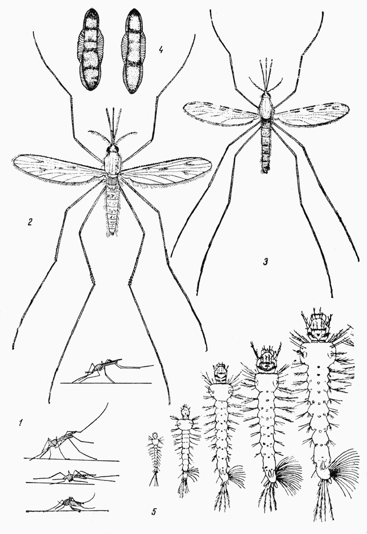 Таблица LI. Малярийный комар - Anopheles: Рис. 1. Посадка самок комаров Anopheles maculipennis: нормальная (вверху), полу зимовочная, зимовочная; Culex pipiens - нормальная внизу (по Беклемишеву). - Рис. 2. Малярийный комар обыкновенный (Anopheles maculipennis) (по Штакельбергу). - Рис. 3. Малярийный комар украшенный (Anopheles superpictus) (по Штакельбергу). - Рис. 4. Яйца обыкновенного малярийного комара (из Павловского). - Рис. 5. Возрасты личинок малярийного комара (Anopheles pulcherrimus): 1-й, 2-й, 3-й, 4-й (две личинки справа) (по Чинаеву).