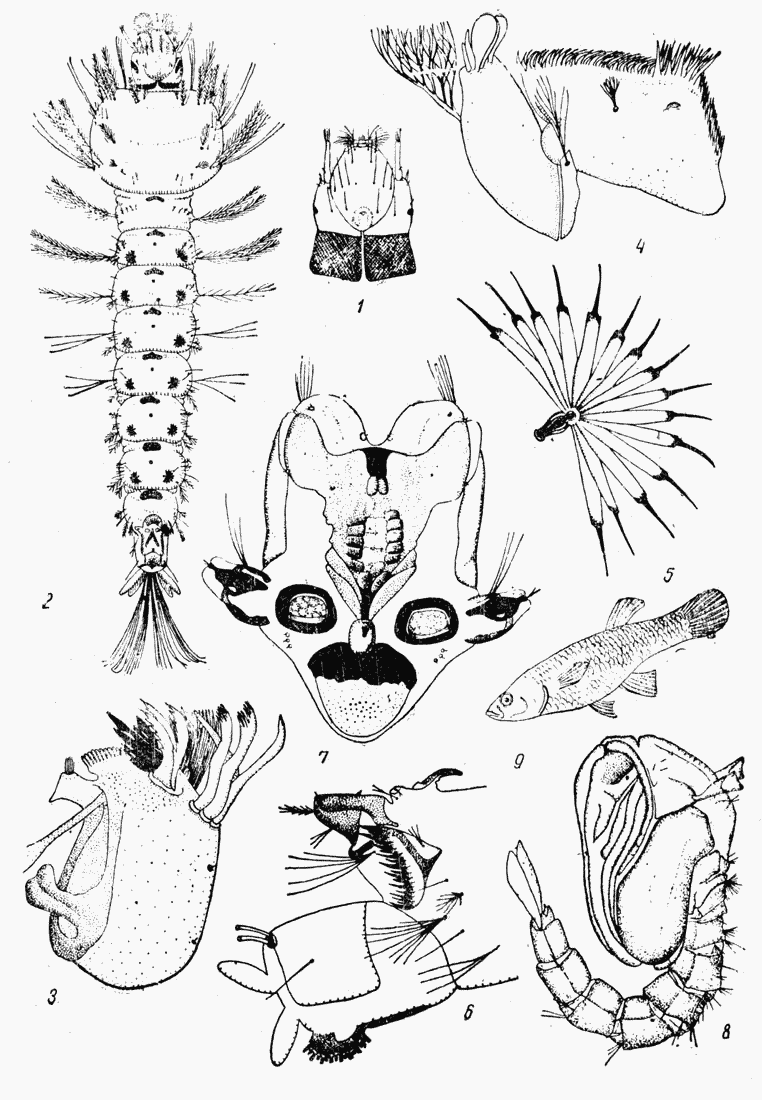 Таблица LV: Рис. 1. Рыбы в поисках за личинками тендипедид (по Гессе-Дофлейну). - Рис. 2. Личинки - минеры в листе телореза. - Рис. 3. Лаутерборнов орган. - Рис. 4. Домики личинки танитарзус (Rheotanytarsus). - Рис. 5. Личинки Tanytarsini в домиках. - Рис. 6. Проторакальный рог куколки аблабесмии. - Рис. 7. Личинка прокладиус (Procladius = Tanypus). - Рис. 8. Жвала пелопий. - Рис. 9. Куколка аблабесмии (Ablabesmyia) (по Липиной и Черновскому). - Рис. 10. Личинка кулик о идее (Culicoides).