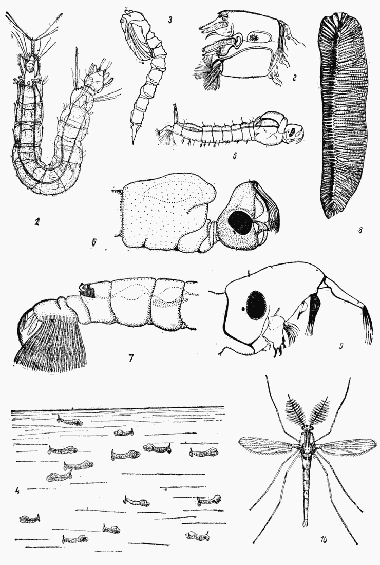 Таблица LIII: Рис. 1. Личинка комара диксы (Dixa amphibia). - Рис. 2. Голова личинки диксы сбоку. - Рис. 3. Куколка диксы. - Рис. 4. Личинка комара мохлоникс (Mochlonyx culiciformis) в воде. - Рис. 5. Личинка мохлоникс (Мосhlопух culiciformis). - Рис. 6. Голова и грудь личинки комара криофилы (Cryophila lapponica) (по Мончадскому). - Рис. 7. Конец брюшка личинки криофилы (но Мончадскому). - Рис. 8. Ситовидный аппарат личинки криофилы (но Мончадскому). - Рис. 9. Голова личинки коретры (Chaobonis crystallinus) (но Мончадскому). - Рис. 10. Коретра, самец (Chaobonis crystallinus).