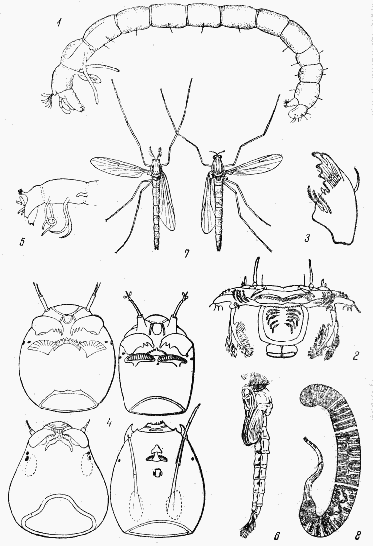 Таблица LIV: Рис. 1. Личинка комара тендипес (Tendipes группа plumosus). - Рис. 2. Верхняя губа личинки тендипес (Tendipes гр. plumosus). - Рис. 3. Жвалы личинки тендипес (Tendipes гр. plumosus). - Рис. 4. Голова личинок тендипедид вентрально; вверху - Tendipedini (слева) и Tanytarsini; внизу - Orthocladiinae и Pelopiinae (справа) (по Липиной). - Рис. 5. Конец тела личинки тендипес (Tendipes гр. plumosus) (по Липиной). - Рис. 6. Куколка тендипес- Рис. 7. Тендипес, самец и самка (справа). - Рис. 8. Яйцекладки тендипес.