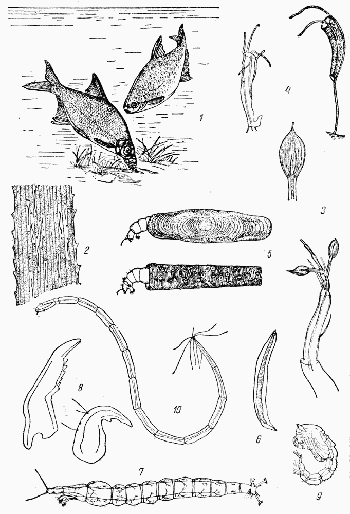Посвятим одну из экскурсий ознакомлению с жизнью ила на дне пруда или небольшого озера. Зачерпнув хорошую порцию ила сачком или драгой и промыв его через решето, мы обнаруживаем червеобразных крупных личинок насекомых ярко красного цвета - личинок комара-мотыля (Tendipes = Chironomus) из подсемейства Tendipedinae семейства Tendipedidae (LIV, 1).