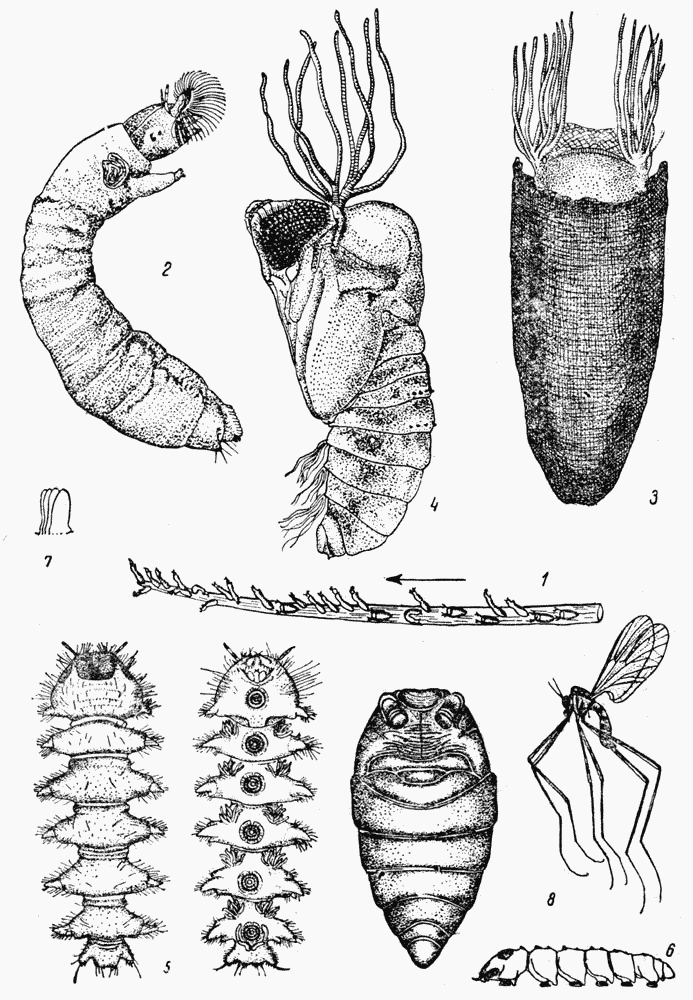 Длина взрослой личинки достигает 4 мм. Тело её явственно подразделено на голову, грудь и брюшко (LVII, 1). Голова темнее прочих сегментов тела; вентральная сторона тела светлее дорзальной. У личинки маленькие глаза и длинные чувствительные усики, состоящие из базального членика и двух ветвей - короткой и длинной. Верхняя губа представляет хорошо развитую вытянутую и свисающую вниз пластинку, снабженную изнутри и снаружи коротенькими волосками (LVII, 2). Своеобразно устроены жвалы: на внутренней стороне они несут гребень из тонких и твердых хитиновых пластинок, а дистально ряд щетинок (LVII, 3). Нижние челюсти поперечно вытянутые; спереди и на внутренней поверхности их расположены ряды волосков, а снаружи небольшой щупик; медиально нижние челюсти соприкасаются друг с другом, так как нижняя губа отсутствует, и функция её исполняется ими. Весь сложно устроенный ротовой аппарат личинки служит для соскабливания с поверхности камней диатомовых водорослей и других микроорганизмов, которыми личинка питается; гребешками и щетинками жвал и волосками максилл личинка пользуется для препровождения в рот пищи и отфильтровывания от неё воды.