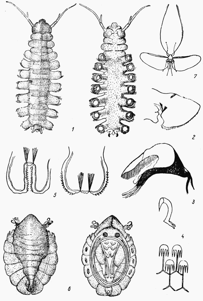 Таблица LVII. Дейтерофлебия удивительная - Deutebophlebia mibabilis: Рис. 1. Личинка дорзально и центрально (по Пуликовской). - Рис. 2. Верхняя губа личинки (по Пуликовской). - Рис. 3. Жвала личинки (по Пуликовской). - Рис. 4. Крючки присосок личинки (по Пуликовской). - Рис. 5. Ложные ножки - присосавшаяся и вытянутая (направо) (по Пуликовской). - Рис. 6. Куколка дорзально и вентрально (по Пуликовской). - Рис. 7. Imago (по Эдвардсу).