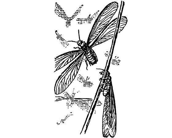 Фриш описывает прыгательное устройство коллембола, их упругую, подогнутую под брюшко вилку. Добавим, что она подогнута только у живых ногохвосток, у мертвых же вытянута назад в виде расщепленного хвоста: прыгательную вилку удерживает под нижней стороной брюшка сильная зацепка. У живого насекомого зацепка постоянно напряжена и, едва механизм срабатывает, вилка, выпрямляясь, с силой отбрасывает насекомое вверх и назад, и оно совершает таким образом прыжок, похожий на полет.