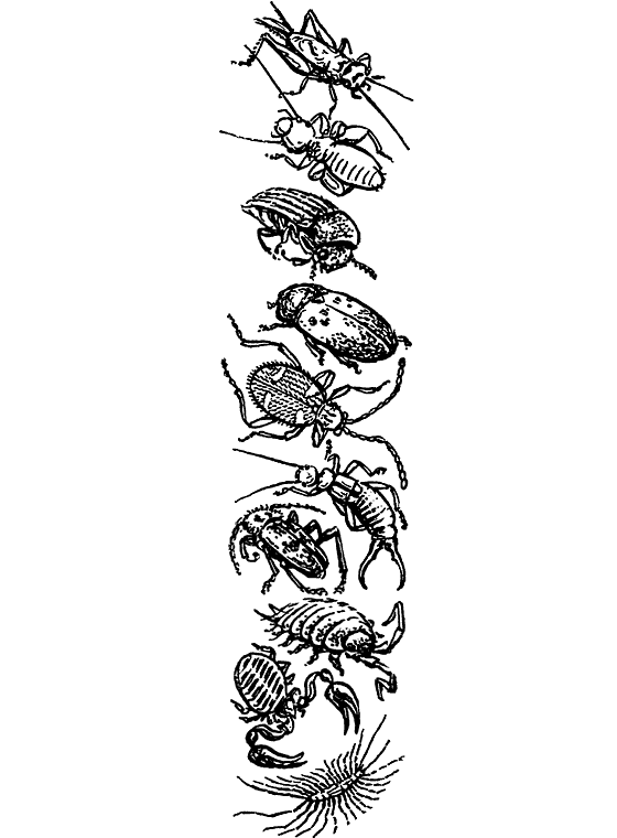 Сверху вниз показаны: сверчок обыкновенный, сеноед, жучок-точильщик анобиум, кожеед, притворяшка-вор, уховертка, домовый усач, мокрица, лжескорпион, многоножка-мухоловка. На рисунке все изображены примерно одинаковыми по размеру, тогда как на самом деле одни показаны с гораздо большим увеличением, чем другие.