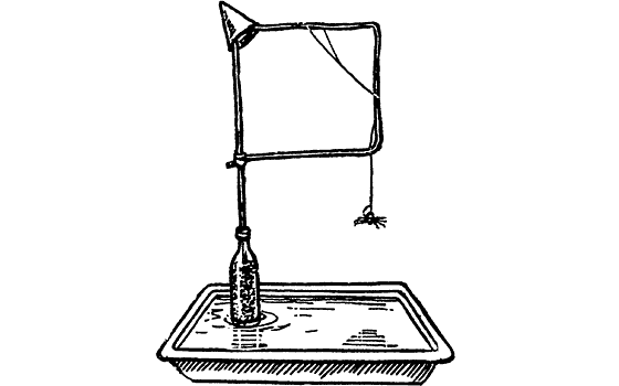 Когда таким образом подготовлен десяток пробирок, из сетчатой клетки отбираются тараканы. Каждый закрепляется перепончатой шейкой между расщепленных язычков целлулоида: один — телом в канале пробки, а головой наружу, другой — головой в канале пробки, телом наружу, третий — подобно первому, четвертый — подобно второму, и так до тех пор, пока все десять пробок не подготовлены к началу опыта.