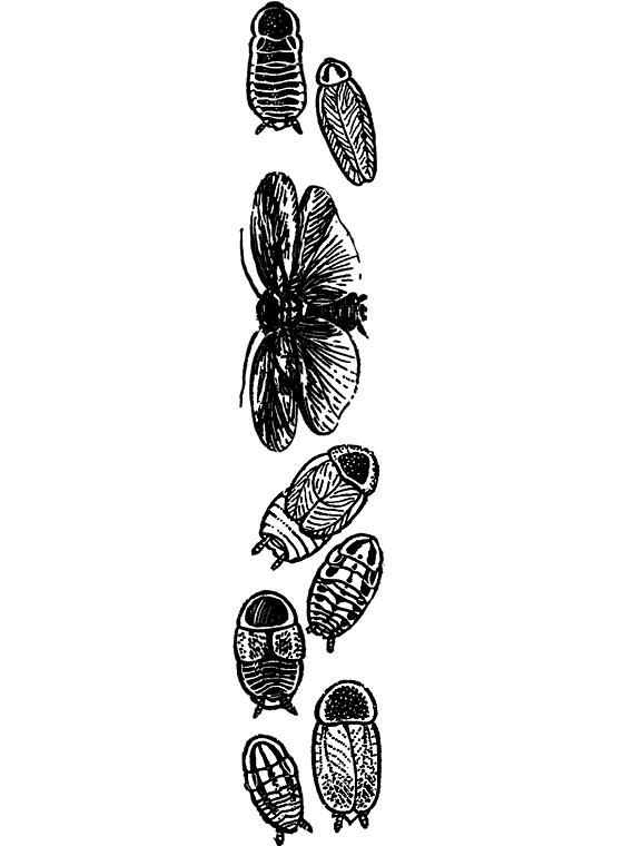 Тараканы разных видов. Все они, кроме тропического таракана гигантского, изображены без передних крыльев, усиков и ножек, чтоб лучше можно было рассмотреть форму тела.