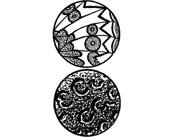 Наверху — часть узора на крыльях бабочки мелянаргии из семейства нимфалид. Внизу — узоры на надкрыльях жука-бронзовки.