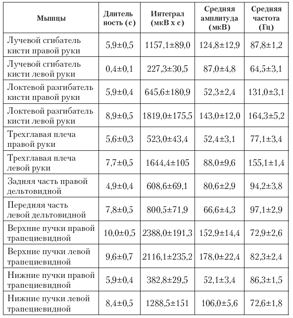 Анализ продолжительности электроактивности исследуемых мышц, косвенно отражающий период проявления мышечных усилий, показал, что длительность ЭМГ колеблется в диапазоне от 0,4 с до 10 с. У верхних пучков правой и левой трапециевидных мышц усилия продолжались более длительно – 10,0±0,5 с и 9,6±0,7 с соответственно. Минимальный период активности наблюдался у лучевого сгибателя кисти левой руки – 0,4±0,1 с.