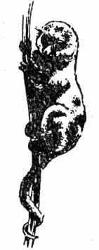 Конечно, долгопят далеко не беззубый, но когда он раскрывает свой V-образный рот, довольно зловещий, то кажется, что у него нет зубов. Действительно, долгопят — единственный примат, которого можно целиком считать плотоядным. Ему доводится пробовать иногда и фрукты, но главным образом его пищу составляют насекомые, ящерицы, птицы и даже некрупные млекопитающие. В наших глазах это всего лишь симпатичный малыш, но на уровне своего размера это кровожадный разбойник.