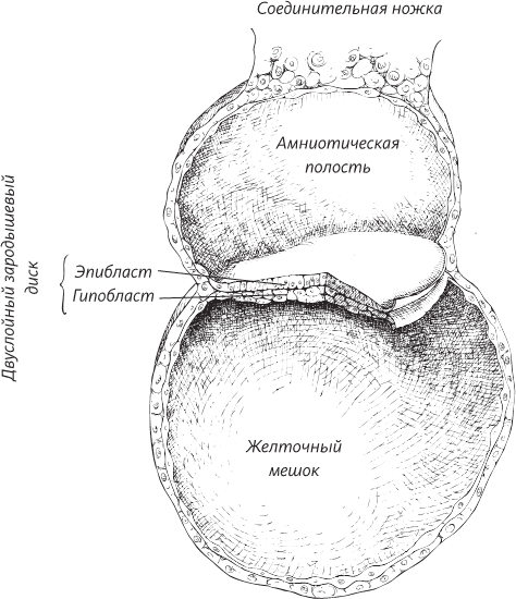 Ранее в этой книге мы оставили человека на стадии развивающегося эмбриона, имплантированного в стенку матки. Внутренняя клеточная масса морулы, похожей на тутовую ягоду, превращается в плоский двухслойный диск, зажатый между желточным мешком и новообразованной амниотической полостью. Верхний листок этого диска называют эпибластом, а нижний – гипобластом, или эндодермой.