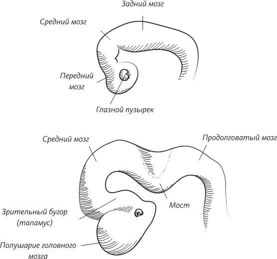 На четвертой неделе внутриутробного развития новообразованная нервная трубка, слегка расширенная на переднем конце, разительно напоминает нервную трубку примитивного хордового животного, такого, как ныне живущие ланцетники или древние вымершие хайкоуэллы. Человеческому мозгу предстоит еще долгий путь дальнейшего развития, а мозг ланцетника у взрослого животного представляет собой именно легкое расширение на переднем конце нервной трубки и едва ли превосходит сложностью спинной мозг. У позвоночных, включая и нас, более сложный мозг начинает формироваться уже в эмбриональном периоде; передний конец слепо заканчивающейся нервной трубки расширяется, образуя три соединенных между собой пузыря, из которых развиваются передний мозг, средний мозг и задний мозг соответственно. Развитие заднего мозга контролируется генами семейства Hox, определяющими план строения тела у многоклеточных. Эти гены имеют очень древнее происхождение – варианты этого гена присутствуют у плодовой мушки, а наш общий с ней предок жил около 800 миллионов лет назад. Области переднего и среднего мозга формируются под влиянием более молодых генов, которые возникли после эволюционного расхождения первично- и вторичноротых, но перед возникновением хордовых животных.