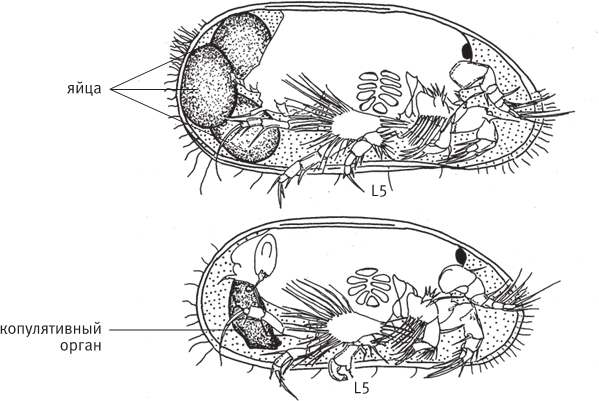 рис. 13.1. Половой диморфизм у современной остракоды Vestalenula cornelia. Вид справа, правая створка удалена. Вверху — самка, внизу — самец с крупным копулятивным органом. Половой диморфизм затрагивает также строение пятой пары конечностей (L5), которую самцы используют для удержания самки во время копуляции. По рисунку из Ozawa, 2013.