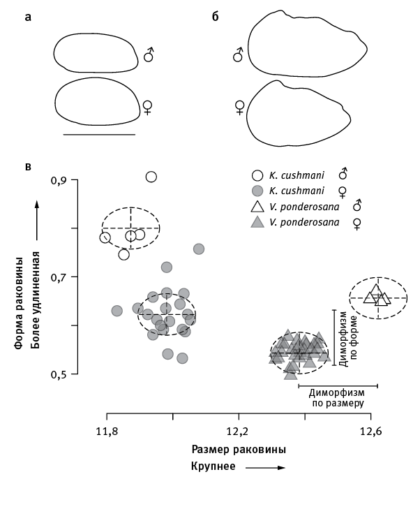 рис. 13.2. Половой диморфизм у двух видов позднемеловых цитероидных остракод. а — очертания раковин самцов и самок Krithe cushmani, б — Veenia ponderosana. На графике (в) по вертикальной оси отложена степень удлиненности раковины (логарифм отношения длины к высоте), по горизонтальной — размер раковины (логарифм площади створки). Видно, что у обоих видов самцы имеют более удлиненную раковину, чем самки (это справедливо и для всех остальных цитероидных остракод). Что касается диморфизма по размеру, то он может иметь разную направленность: у K. cushmani самцы мельче самок, у V. ponderosana — крупнее. По рисунку из Martins et al., 2018.