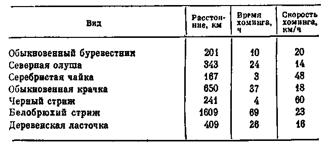Таблица 2. Примеры быстрого хомингового полета птиц (по: Мэтьюз, 1955).