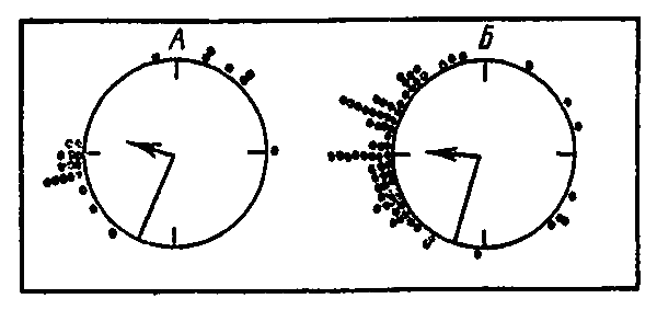 Рис. 32. Стартовая ориентация почтовых голубей в нормальном (А) и измененном (Б) магнитном поле (по: Китон, 1983).
