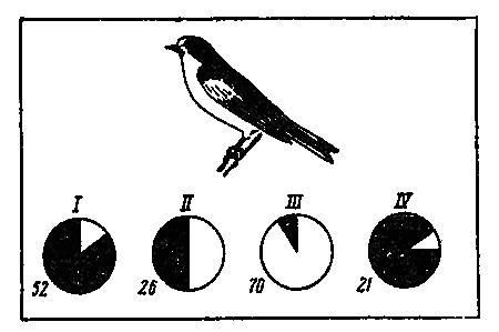 I — взрослые, уже гнездившиеся в районе исследования птицы, II — местные первогодки, III — иммигранты первогодки до начала гнездования, IV — иммигранты первогодки во время кормления птенцов.